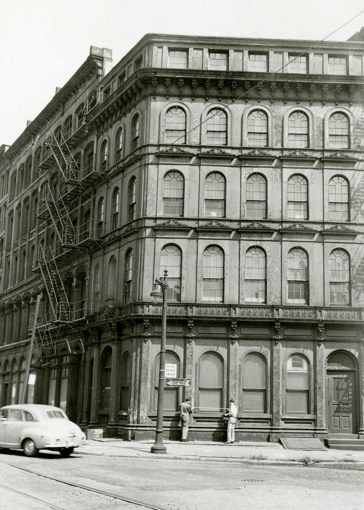 Corner view of cast iron building with semi-circle windows.