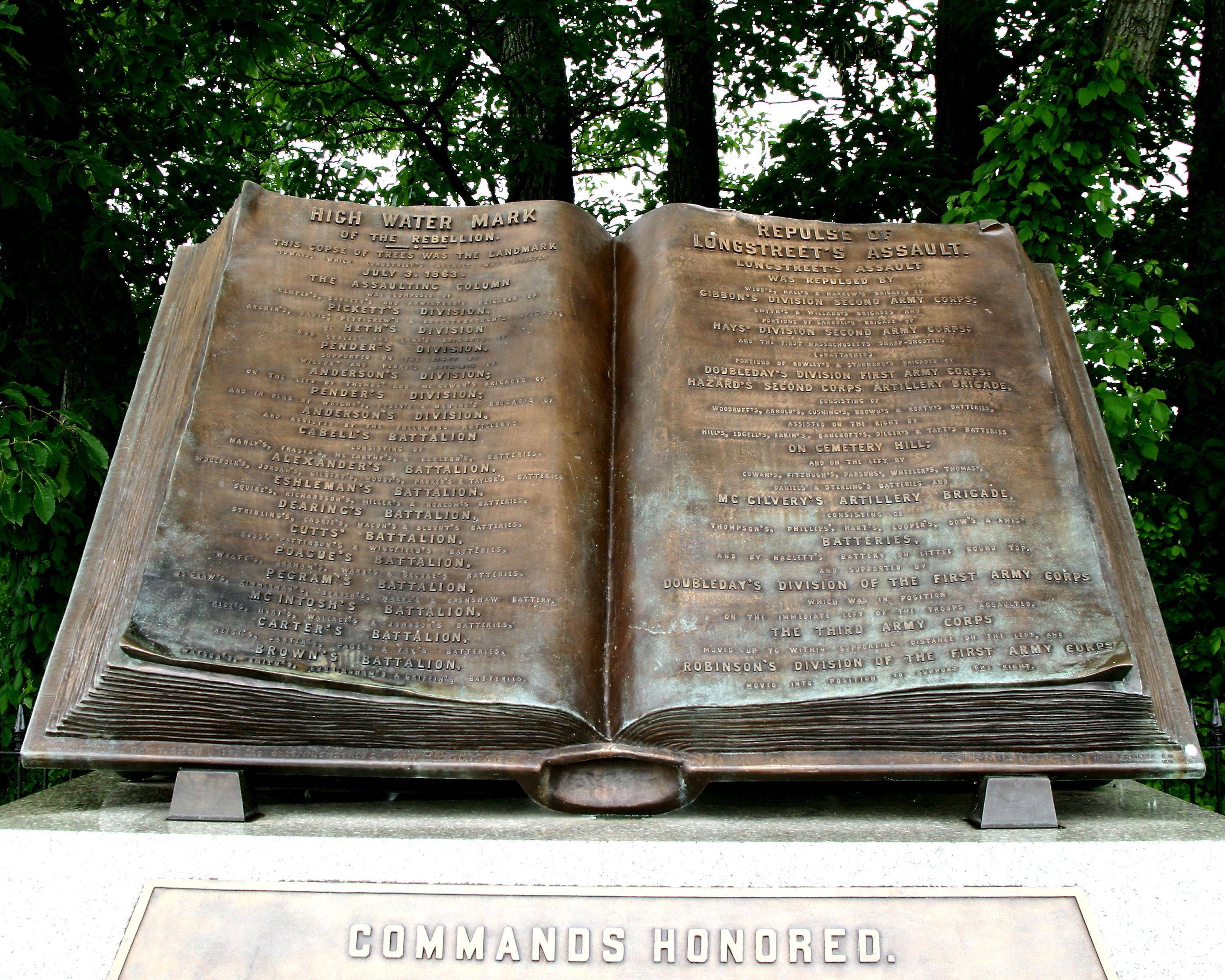 1 of 6 National monuments, second oldest. Commerates both Union and Confederate forces that fought at Gettysburg. Represents the turning point of the rebellion. Located at the Copse of Trees West of North Hancock. || Combined w/Mn 389. Mn base 11'4"sq, rough hewn. Shaft of polished granite, topped w/ oversize open bronze book. Tablets 4 sides w/ rear tablet added 1895 (MN389) listing directors of Gettysburg Battlefield Memorial Association. All 9'H.