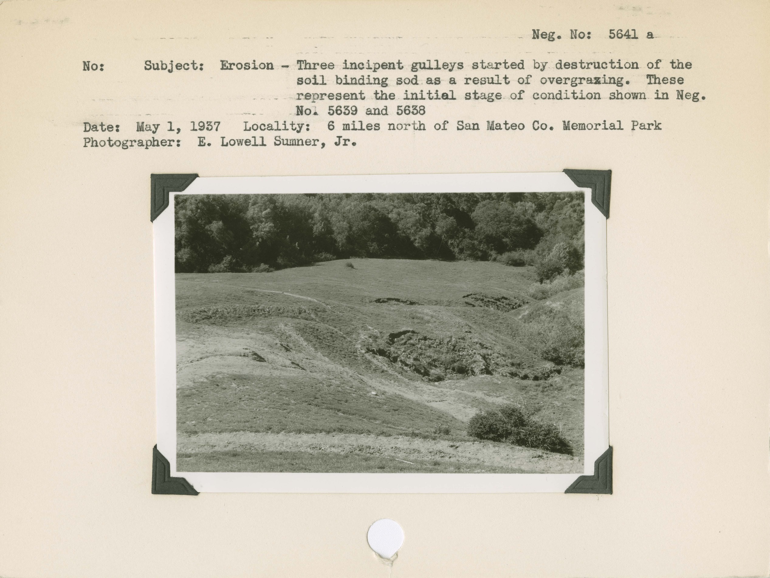 Erosion - Three incipient gullies started by destruction of the soil binding sod as a result of overgrazing. These represent the initial stage of condition shown in negative #5639 and #5638. Locality: 6 miles north of San Mateo County Memorial Park. Negative #: 5641