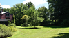 Large grassy area next to home with trees on edges, and one in middle.