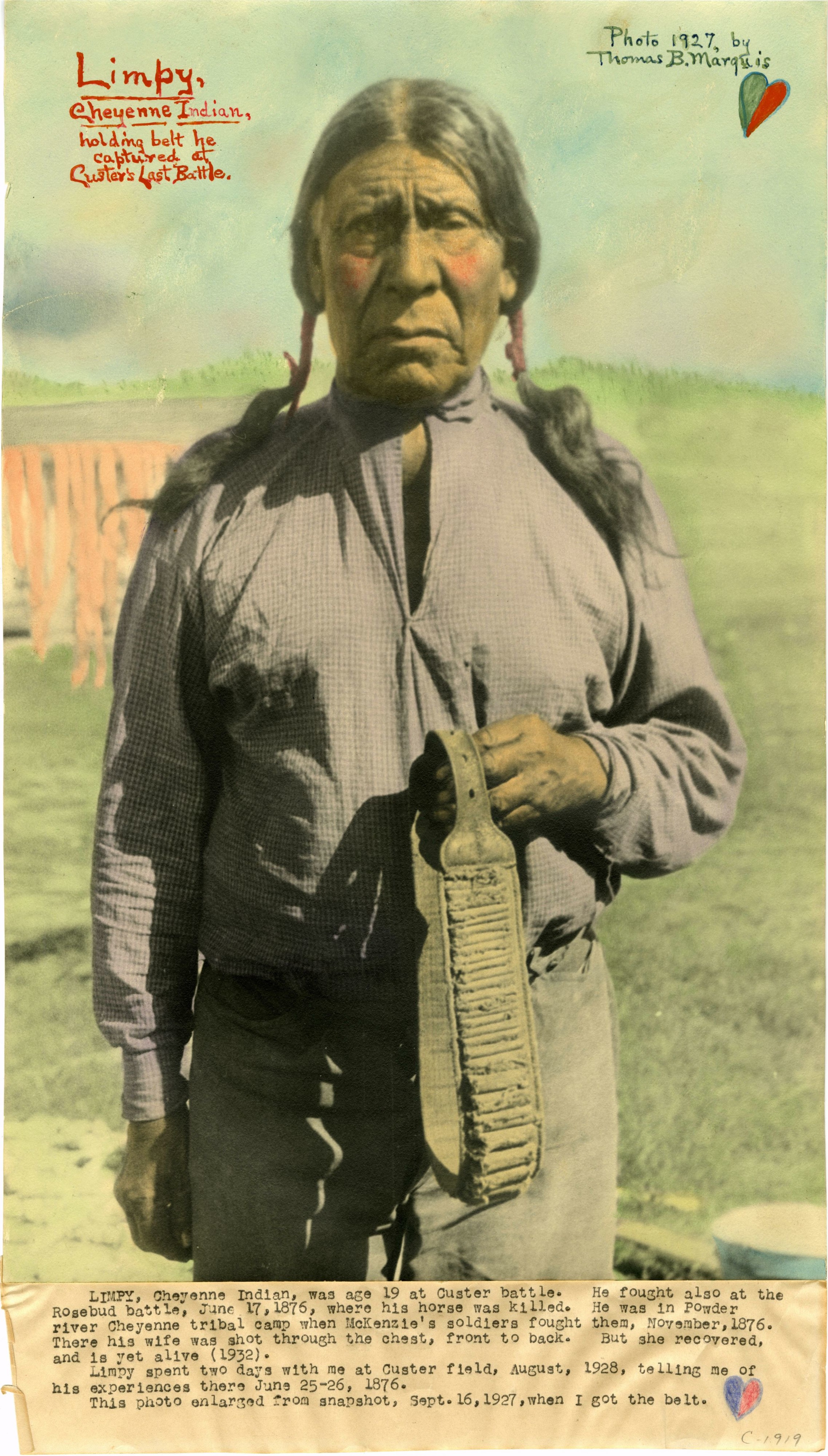 LIBI_00012_01919; A hand-tinted photograph of Limpy, with typewritten caption adhered to bottom of print; produced by Dr. Thomas Marquis, in 1920. Removed from frame in April of 1972.; print, photographic; Courtesy of the National Park Service, Little Bighorn Battlefield National Monument, LIBI_00012_01919, Thomas B. Marquis, "Limpy," 1920