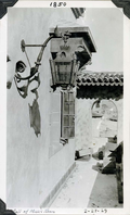 Closeup of wrought iron lantern on exterior wall of Scotty’s Castle Annex Upper Music Room, below Sun Dial, lighting the Upper Music Room Porch. February 27, 1929. Photographed by Mat Roy Thompson. Background shows window to Upper Museum Room, Upper Museum Room Porch floor not yet tiled, and tiled roof over arch at corner of porch. Stacks of small wooden crates stamped: W P Fuller. Inscription in black ink, bottom left corner: Wall of Music Room. In black ink, lower right corner: 2-27-29. Number in black ink in top center refers to historic photograph numbering system: 1850. Black and white, vertical format, 3 x 5 inch. Corner mounted on photograph album page.