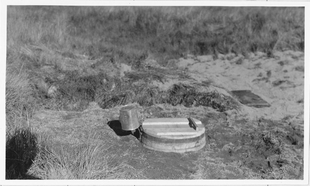 Administrative Collections: Album 5 (Emergency Conservation Works) -Development of spring at Badger Flat showing man with measuring stick collecting water in pail from small pool, barrel buried in ground over spring, and Ranger Richard Book lifting lid of barrel.