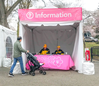 Visitor with a stroller approaching volunteers at an information tent