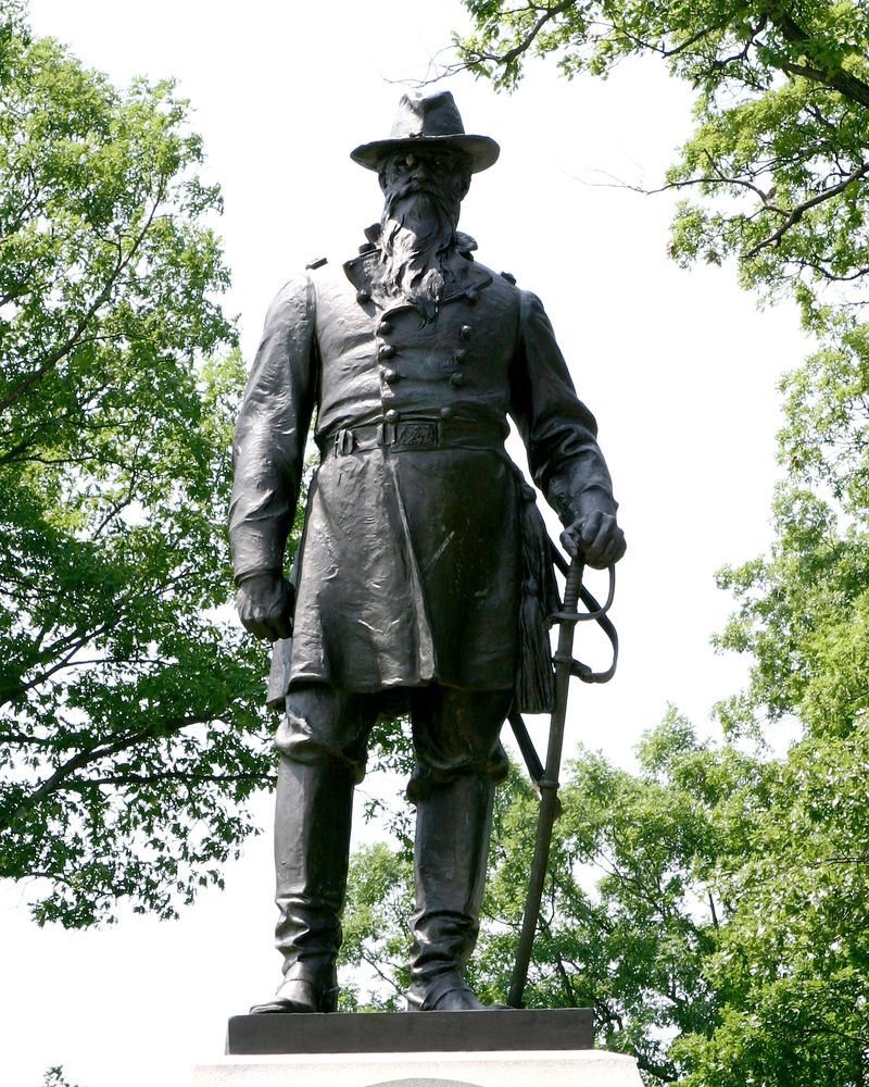 Commemorates Brigadier General John Cleveland Robinson and marks general vicinity of his division during fighting of July 1, 1863. Located on Oak Hill at intersection of Robinson Ave & Doubleday Ave, S of Mummasburg Rd. || Bronze statue of general in uniform, 9', standing on granite pedistal, 11'6" sq at base, 11' high. Bronze inscription tablet mounted on N face of pedestal. Raised letters on N face.
