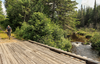 A wide angle image with a cyclist coming down the path on the left side and a bridge and stream in the foreground of the right side