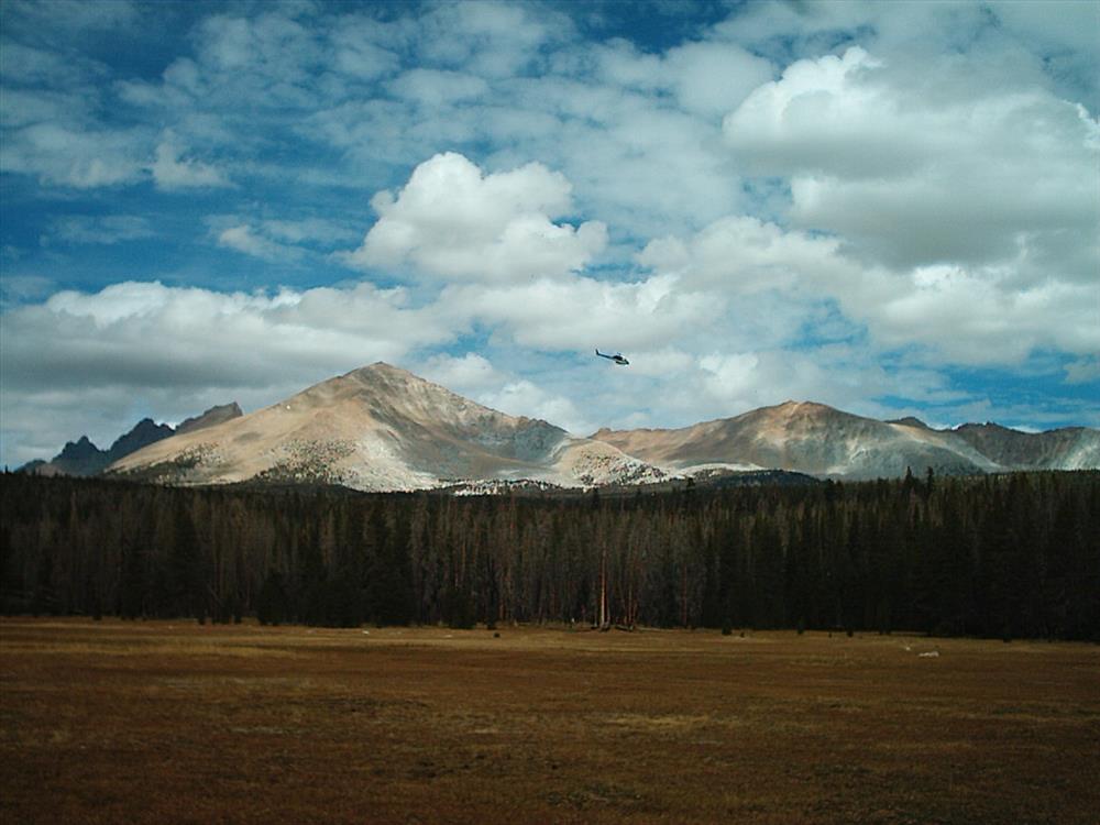 These photos display various views of the Hot Springs Fire on the east Kern Plateau in the wilderness of Sequoia National Park. This wildfire, started by lightning on August 12, 2004, and declared out on October 18, 2004, burned approximately 332 acres. Fire was in Jeffrey Pine, Western White Pine, and Montane Chaparral fuel types, and fire behavior was predominantly limited to smoldering and creeping. On several days small runs were observed in montane chaparral. Hot Springs Fire was monitored on the ground by Sequoia and Kings Canyon National Parks fire monitors for a period of three weeks, and for the remainder was monitored by helicopter aerial recon.