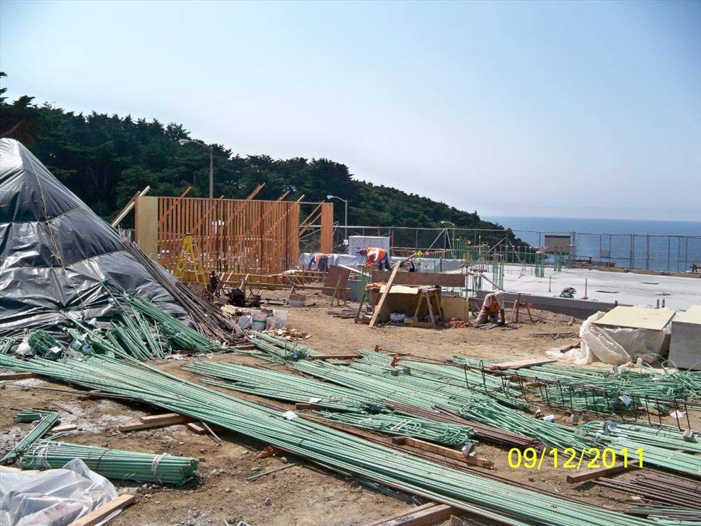 Group 1. Construction photographs for the Lands End Lookout visitor facility at Sutro Heights/Lands End, San Francisco, CA. Construction activities occurred August 2011-May 2012. The project constructed a new, 4100 sq. ft. visitor facility for the Sutro Heights district of Golden Gate National Recreation Area. Facilities include 2500 sf exhibits with integrated retail, 500 sf café, 1000 sf restroom, office for the park Site Stewardship program, and storage. Site improvements included volunteer installation of native plants grown through the parks nursery program, benches made from Monterrey Cypress harvested in the Presidio of San Francisco, and outdoor statuary which are replicas of statues originally located in the adjacent estate of Adolph Sutro, also part of Golden Gate NRA.