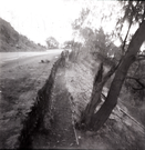 Workers rest for lunch during rebuilding of rock retaining wall alongside road at the tunnel. ; ZION Museum and Archives Image 002.02.01-15of16 ; ZION 15933