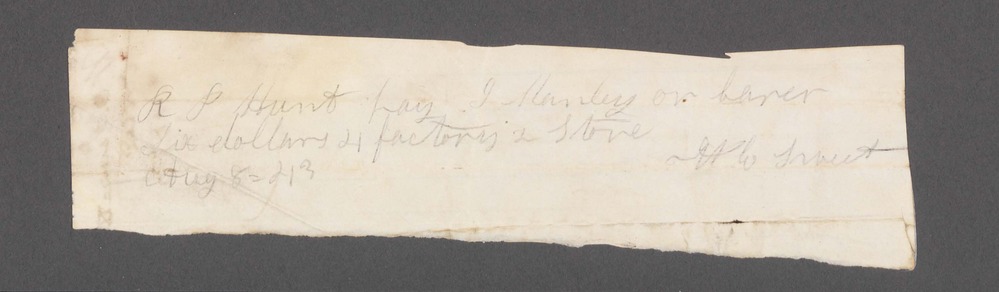 On front of document: "R P Hunt pay J Hanley or barer Six dollars 4 factory 2 store W E Sweet Aug 8 43" On back of document: "W E. Sweet order 4 & 2 $"