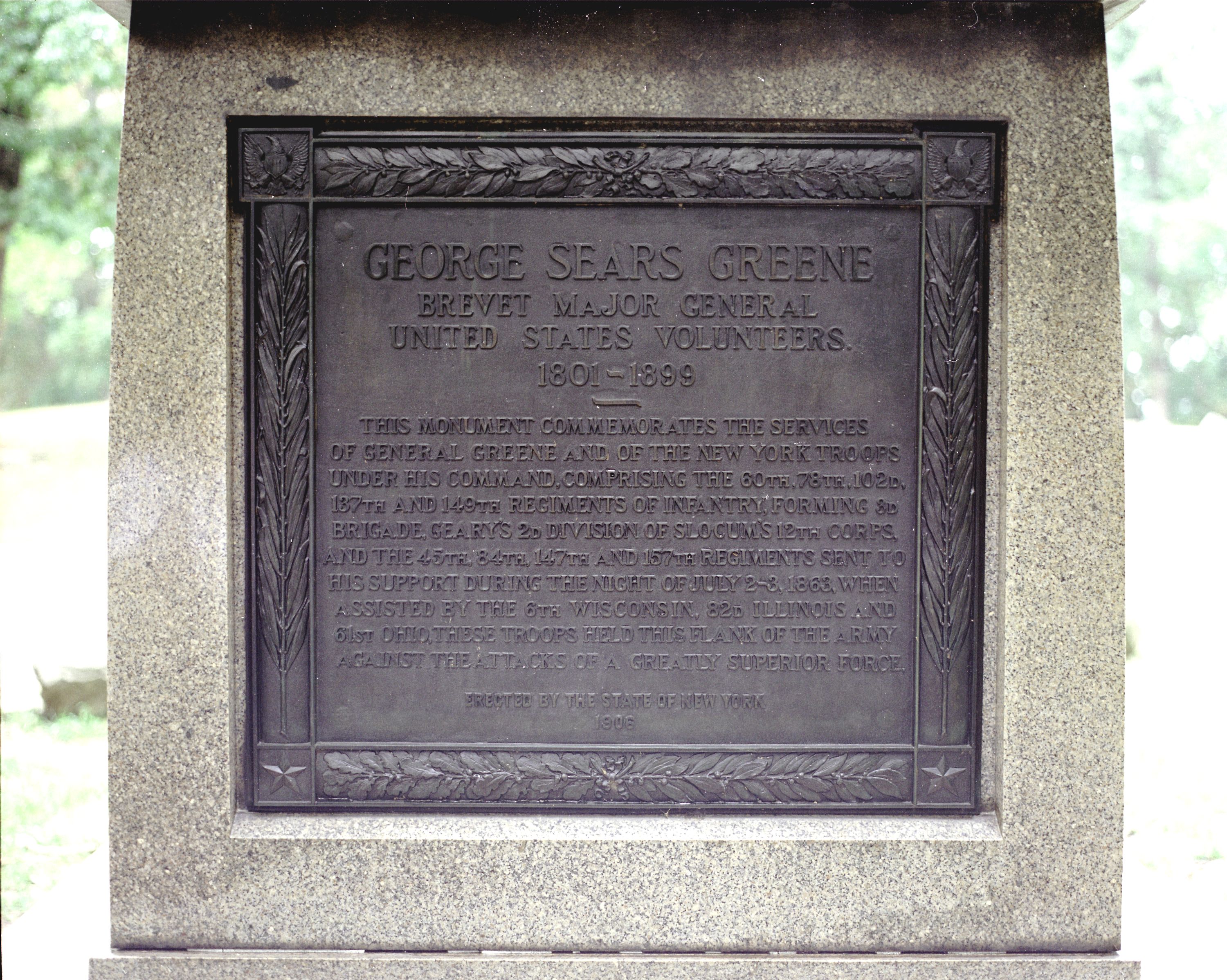 1 of 15 statue monuments in park. Indicates extreme left position held by Greene's line July 2 & 3, 1863. Located summit of Culp's Hill. || Mn base 9'sq rough-cut, tooled-edge. 2 part shaft, 2nd part polished granite w/ set bronze tablets front & rear, bronze star W side, bronze state medallion E side, topped w/ ramparted stone work. Apex Brig. Gen. Greene pointing. All 16'2-1/2" H.