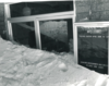 snowdrift covering more than half of a set of glass doors outside a brick building. a frosty glass bulletin board with visitor center hours is partially obscured by the snow.