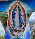 A colorful mural of the Virgin Mary painted on a freeway underpass