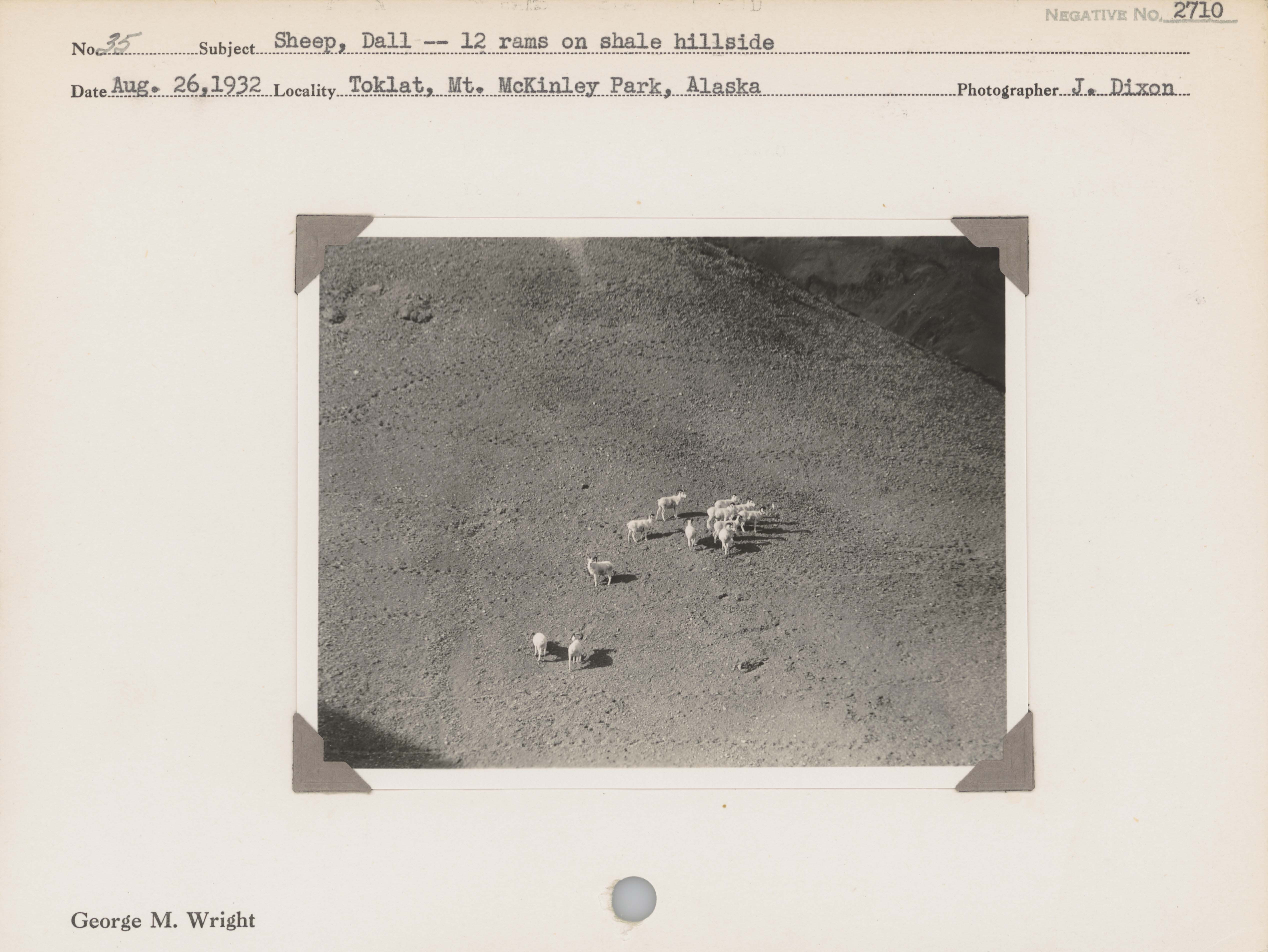 Sheep, Dall--Twelve rams on shale hillside. Locality: Toklat, Mount McKinley Park, Alaska [Denali National Park & Preserve]. Negative #: 2710