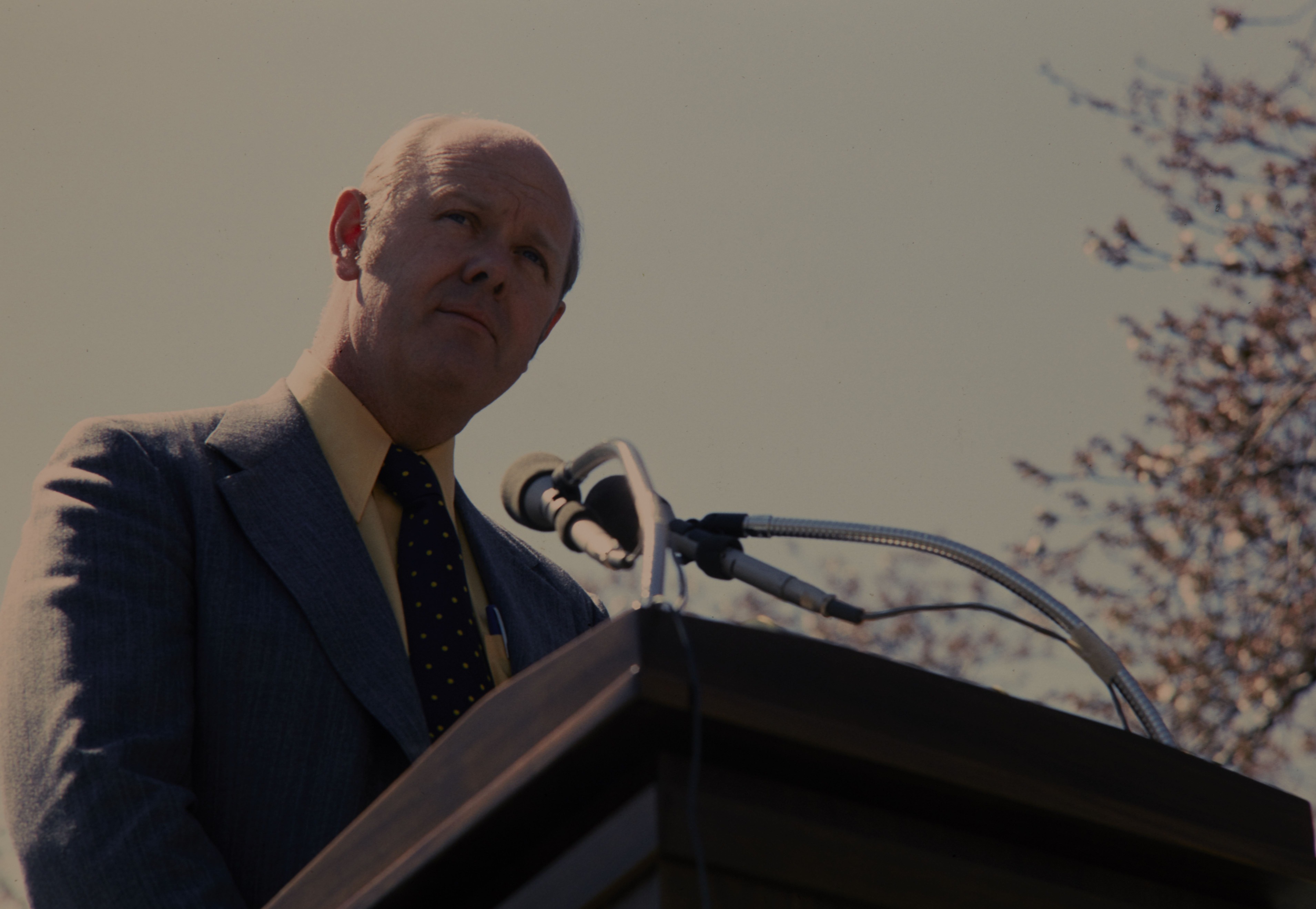 NPS employee talking through a microphone during cherry blossoms season in National Mall and Memorials.