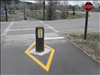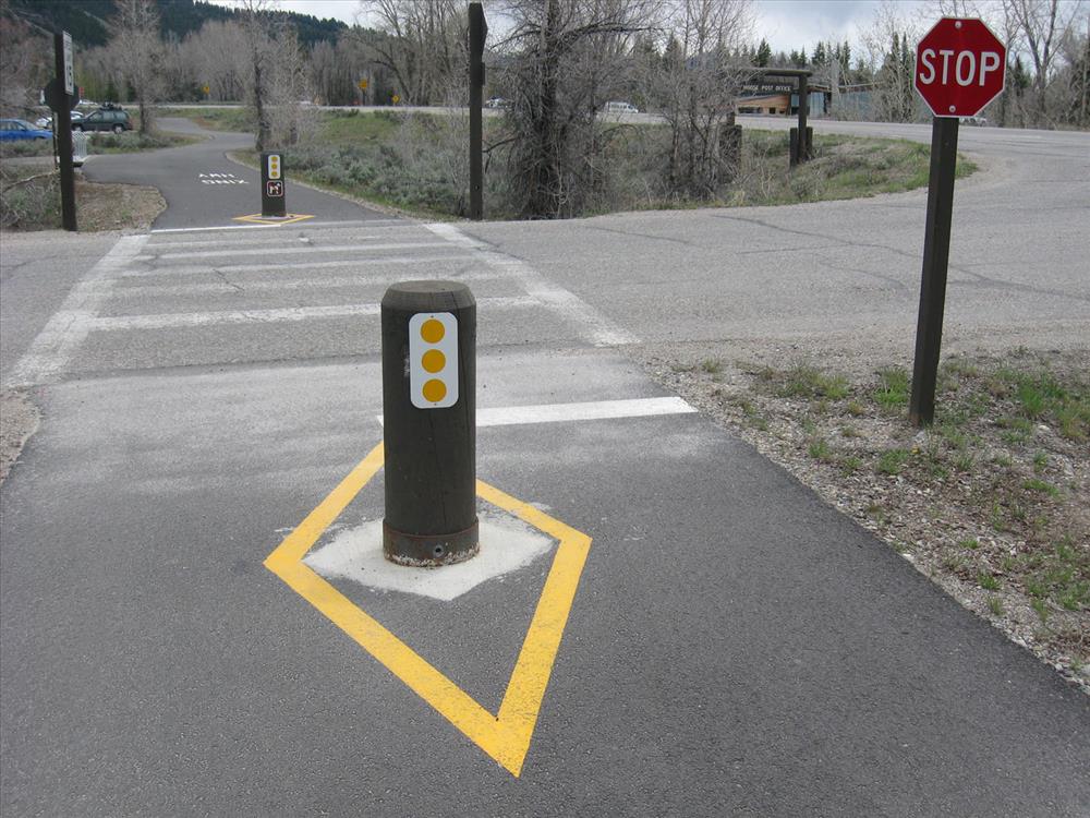 Post Office Access Point on the Grand Tetons Pathway, Phase I. Showing oversized (safety hazard) bollard in the foreground and parking lot in the background.