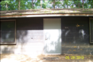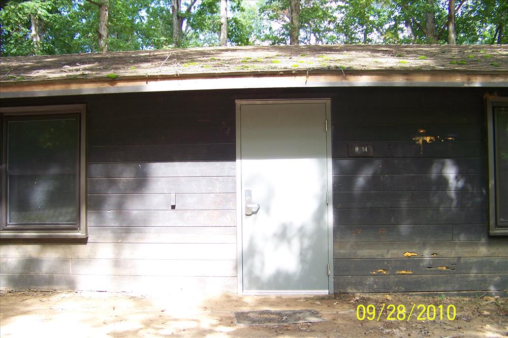 looking northeast at new metal front door with rain guard on dorm B14