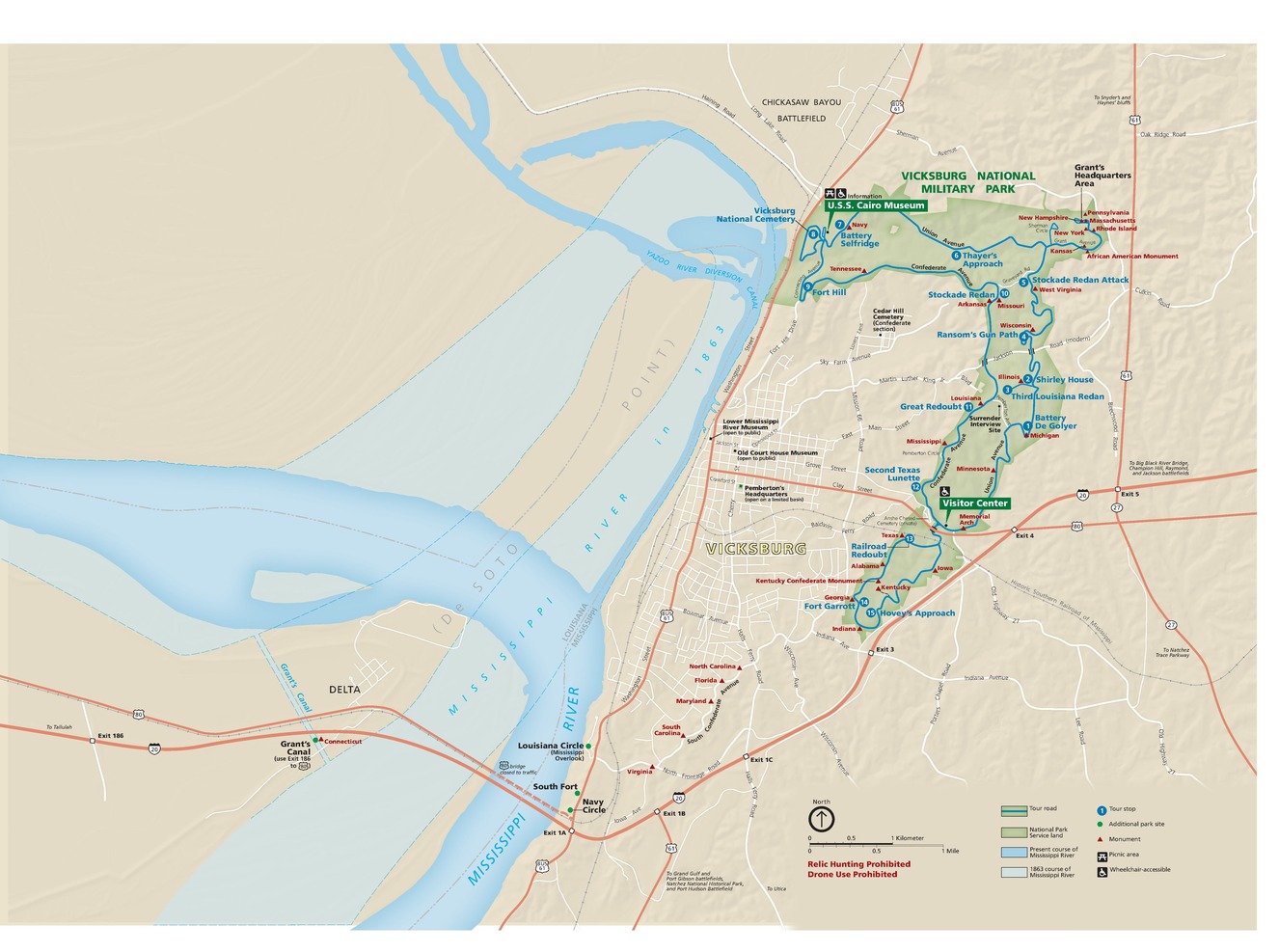 Map of Vicksburg National Military Park in Mississippi. In the right third of the map, the apostrophe-shaped park is outlined in green. The Mississippi River is shown in blue, highways in red, local roads in white, and the terrain in beige.