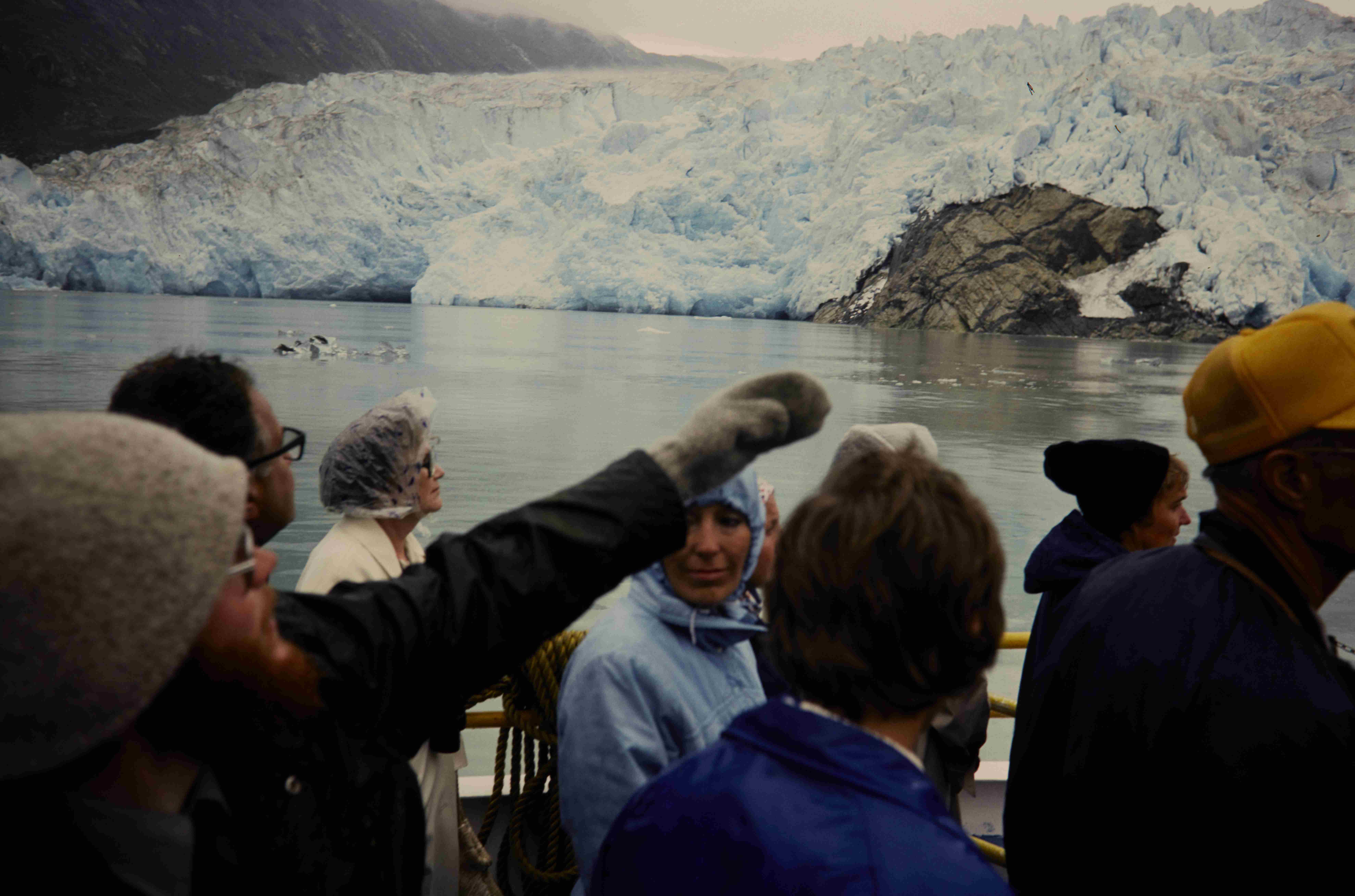 NPS employee talking to visitors on the Thunder Bay as it approaches Riggs Glacier in Muir Inlet in Glacier Bay National Park.