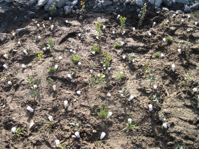 Photographs of seedlings planted in pockets to facilitate the revegetation of the Crystal Creek Rock Quarry within Whiskeytown National Recreation Area. Prior to establishment of Whiskeytown in 1965, a 10.7-mile tunnel was constructed to link Lewiston Reservoir in the Trinity watershed with Whiskeytown Lake in the Clear Creek watershed to supply water to the Central Valley. As a result of tunneling, approximately 350,000 cubic yards of waste rock is stored at the Crystal Creek Quarry site, which covers about 25 acres. Restoration of this site took place between 2010 and 2012.