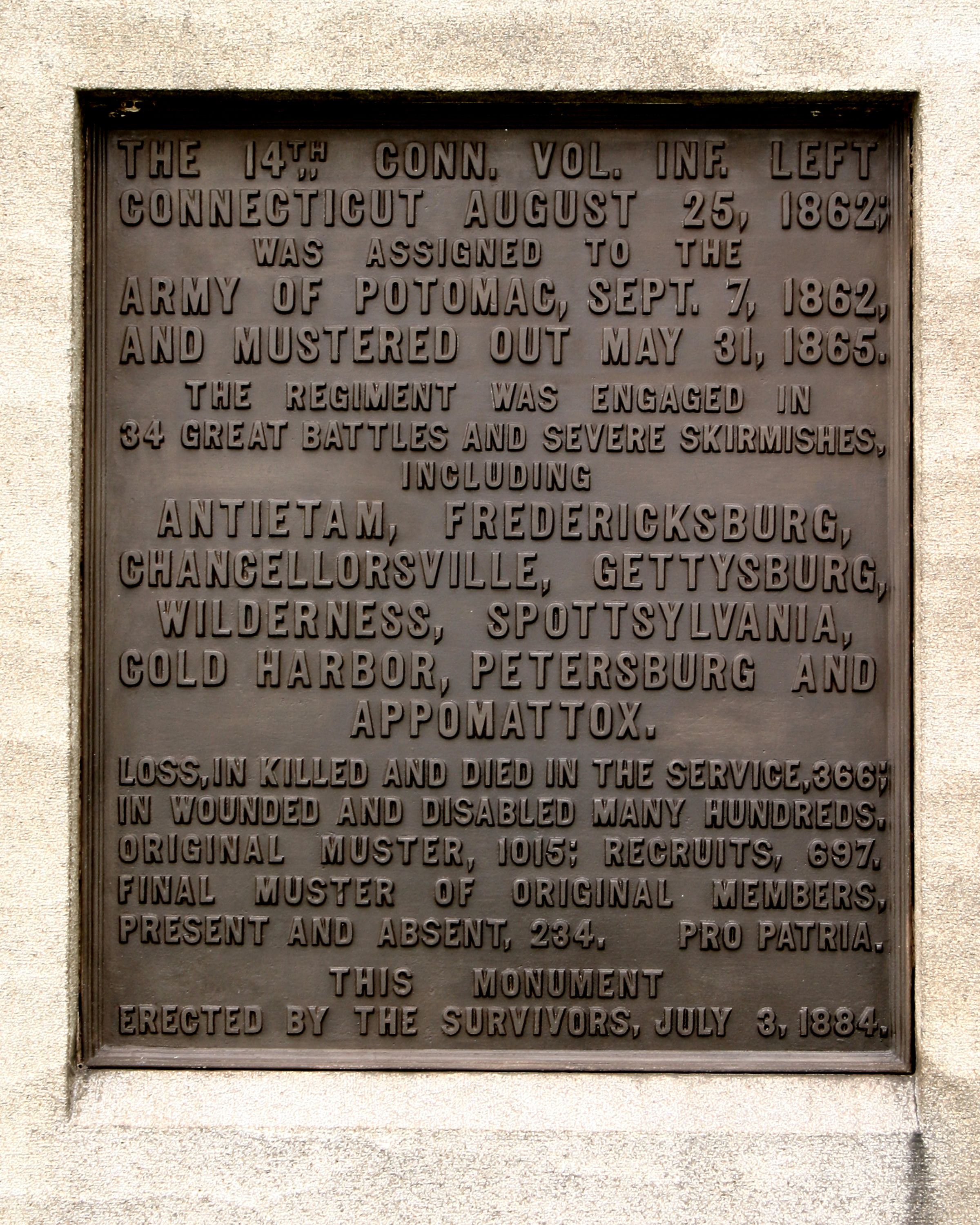 1 of 8 Monuments to Connecticut. Indicates 14th Conn. Infty held position Jul 2-3, 1863 with RF depicting held line. Position Markers show center of Bliss Barn & center of Bliss House. Located N Hancock Av between Brian Barn & the Angle. || Mn, RF, 2 Pos markers, 3 plot markers. Mn base 5'7"sq & 2 part shaft, 1st w/ incised inscription, 2nd w/ bronze tablet on front & back. Cap Pyramid w/ trefoli cap on apex. All 7'9"H. RF: 1'x10'5"x2'7"H. Plot, 1'4"sq x3" & Pos, 3'1"x1'6"x4'.
