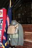 A flag rests on a pole next to another military uniform. The exhibit display sits to the left of the uniform.