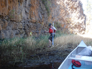Color photograph of a ranger picking up trash on the shore of a river
