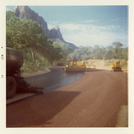 Vehicles driving on road during chipsealing of Zion roads. ; ZION Museum and Archives Image 002.12.05-10of23 ; ZION 15933