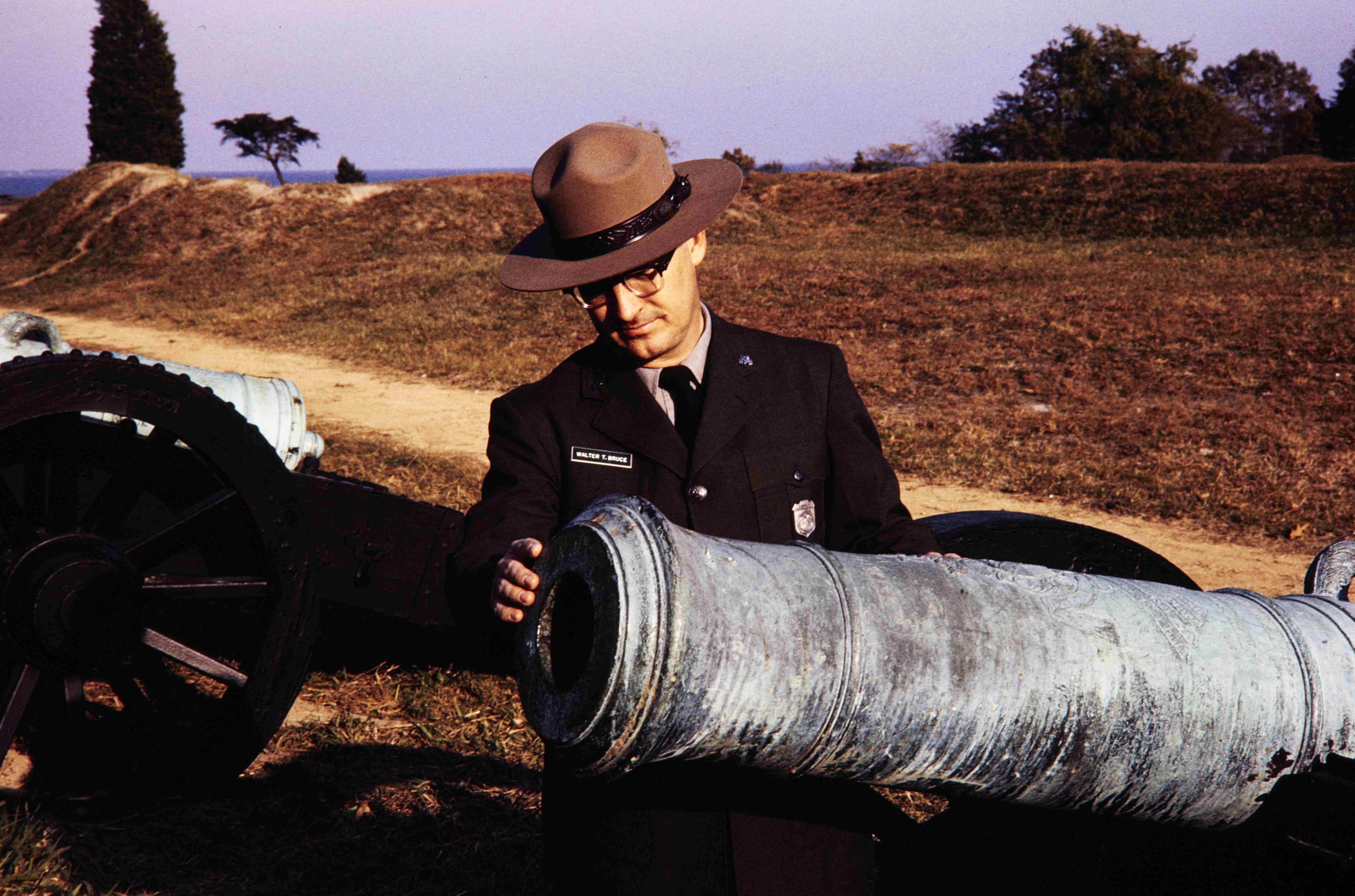 NPS employee, Walter T. Bruce, touching a cannon at Yorktown Battlefield in Colonial National Historical Park.