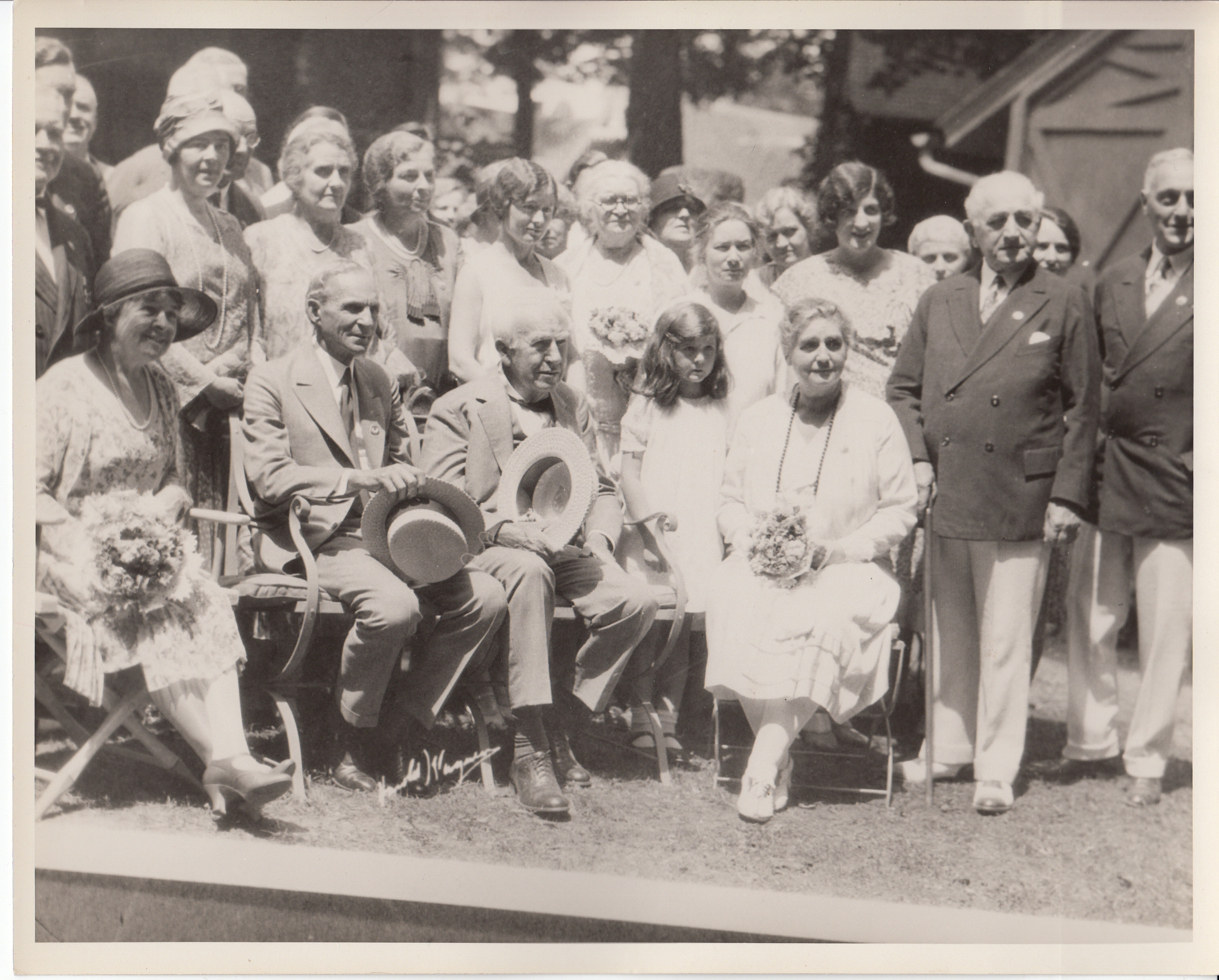 Henry Ford, Thomas Edison, Mina Edison, Adolf Ochs, A. Beston, and others at a Miller family gathering.