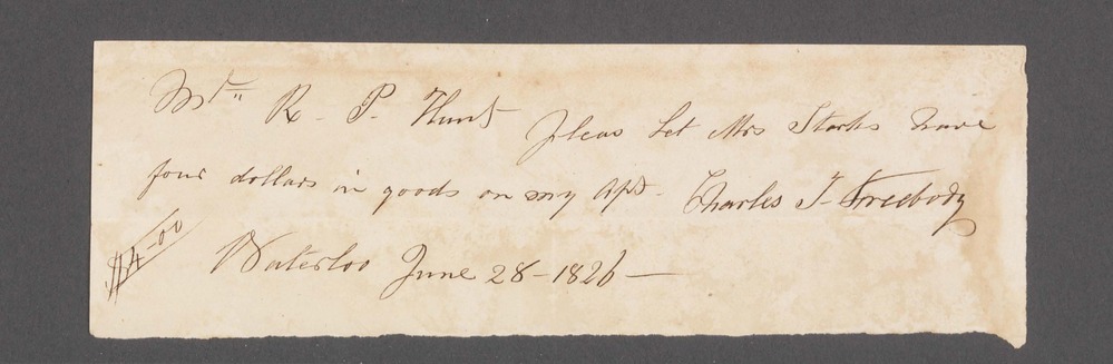 On front of document: "Mr. R.P. Hunt pleas Let Mrs Starks have four dollars in goods on my apt. Charles J. Freebody $4.00 Waterloo June 28 1826" On back of document: "Cha's. J. Freedy"
