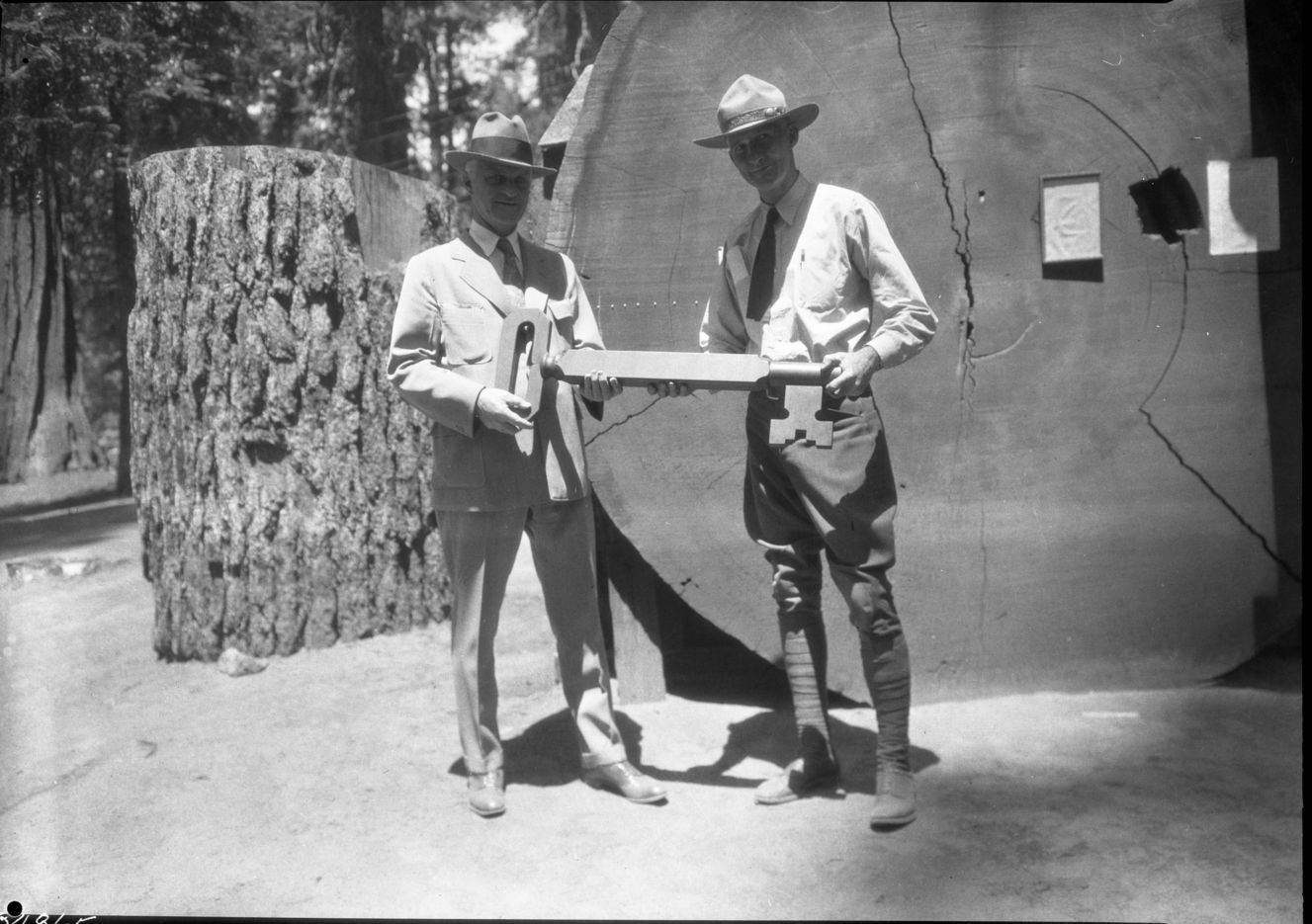 Lindley Eddy, Unknown Date, Giant Forest, SNP, Dedications and Ceremonies, Historic Individuals, Col. John R. White giving Key to Park to Congressman Barbour.