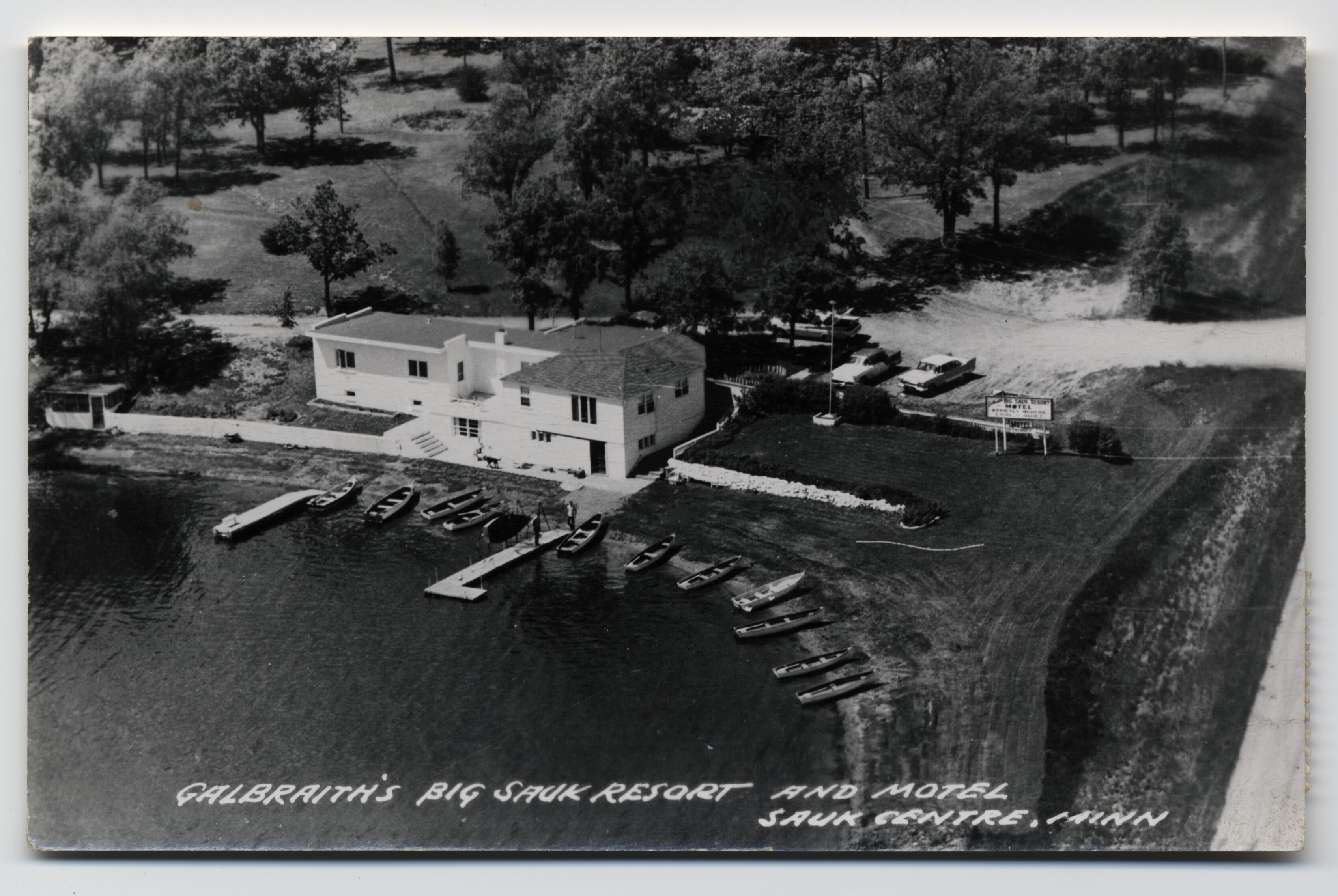 A postcard from Arletta Brown to Bess Truman. The postcard has a photo of a building on a lake with the caption: Galbraith's Big Sauk Resort and Motel / Sauk Centre, Minn.