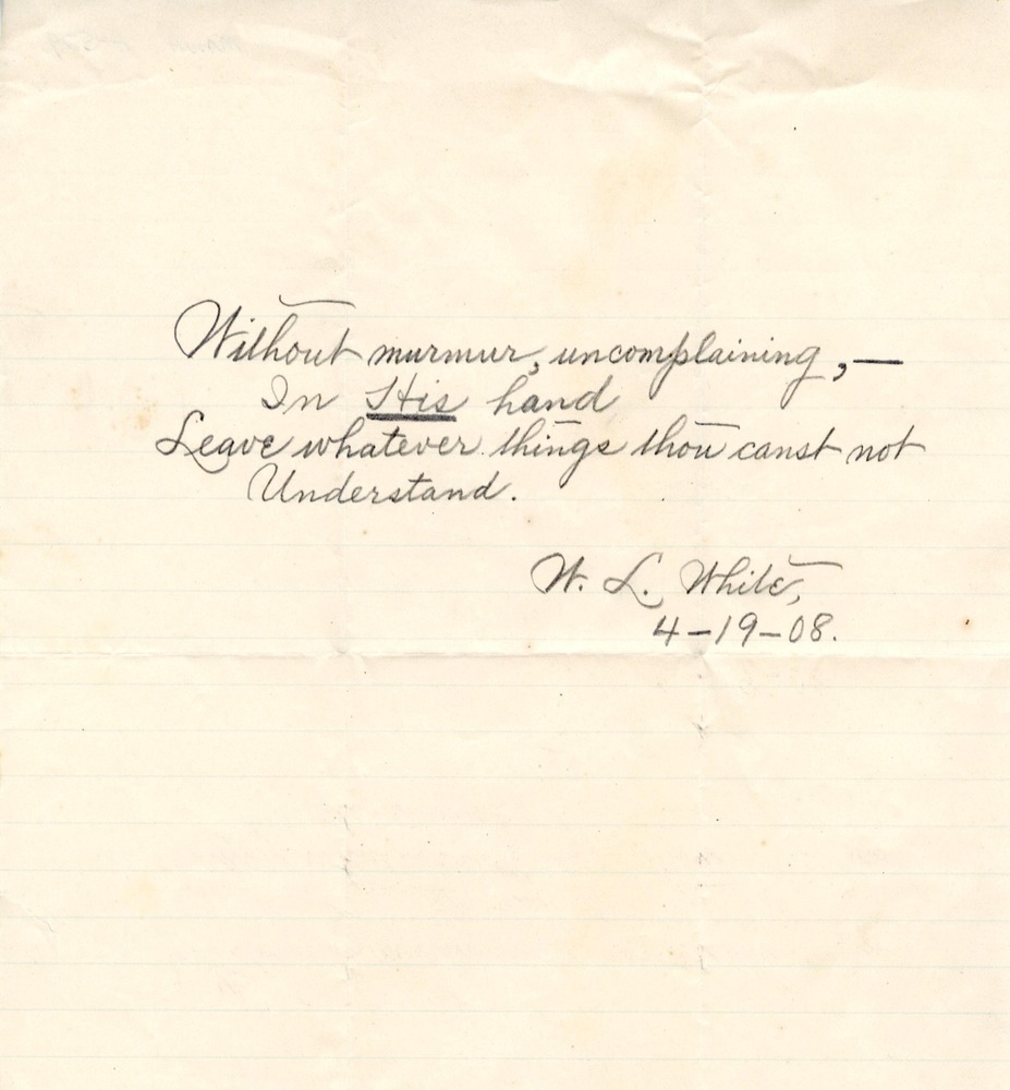 A few lines from a poem by Karl R. Hagenbach which was also sung as a hymn called Peaceful Be. This may have been sent to Walker to lift her spirits after her knee injury.