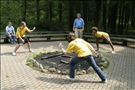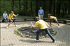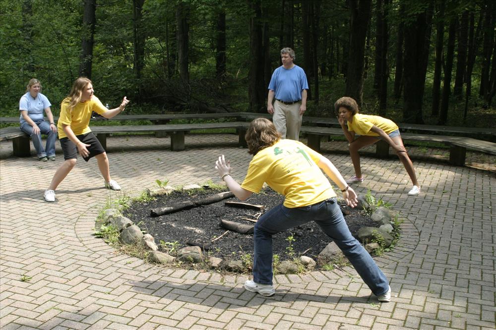 Since the mid-1990s, Cuyahoga Valley Environmental Education Center has offered a variety of summer residential camps. River Run - Theatre: "Fantasy in the Forest" is provided in partnership with Magical Theatre Company. Children entering grades 5-10 work with professional faculty to develop their performing arts skills in acting, voice, movement, and stage combat. The short performances are outdoors and integrate into the natural setting of the CVEEC campus. || Summer theatre campers get fitted for costumes.