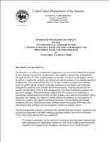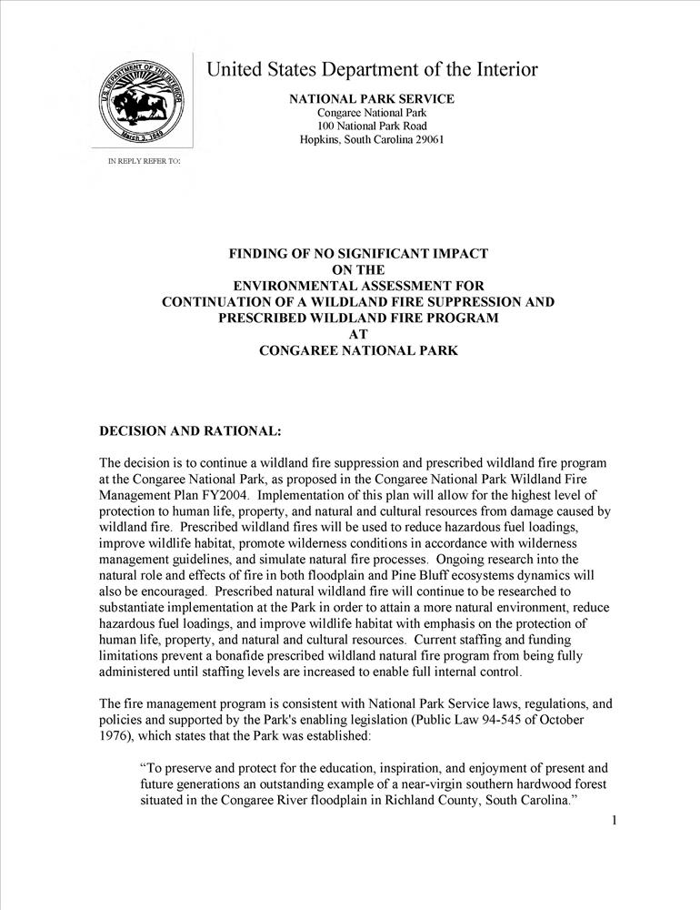Finding of No Significant Impact on the Environmental Assessment for Continuation of a Wildland Fire Suppression and Prescribed Wildland Fire Program at Congaree National Park