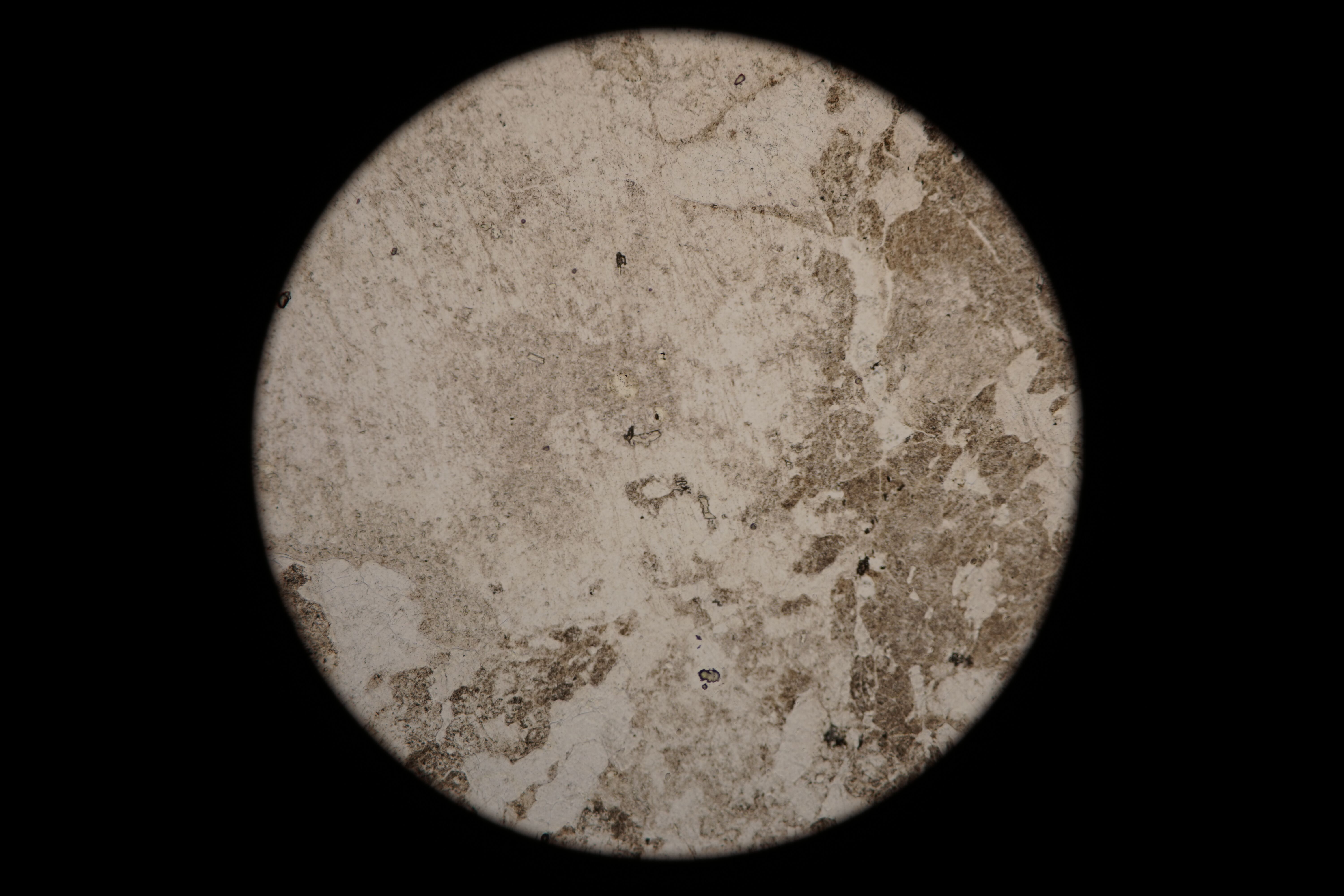 Microscopic image of a thin section of gneiss collected by Peter Misch near Bacon Creek in 1961. One of six images. (Peter Misch Geology Collection, North Cascades NPS Complex Museum Collection.)