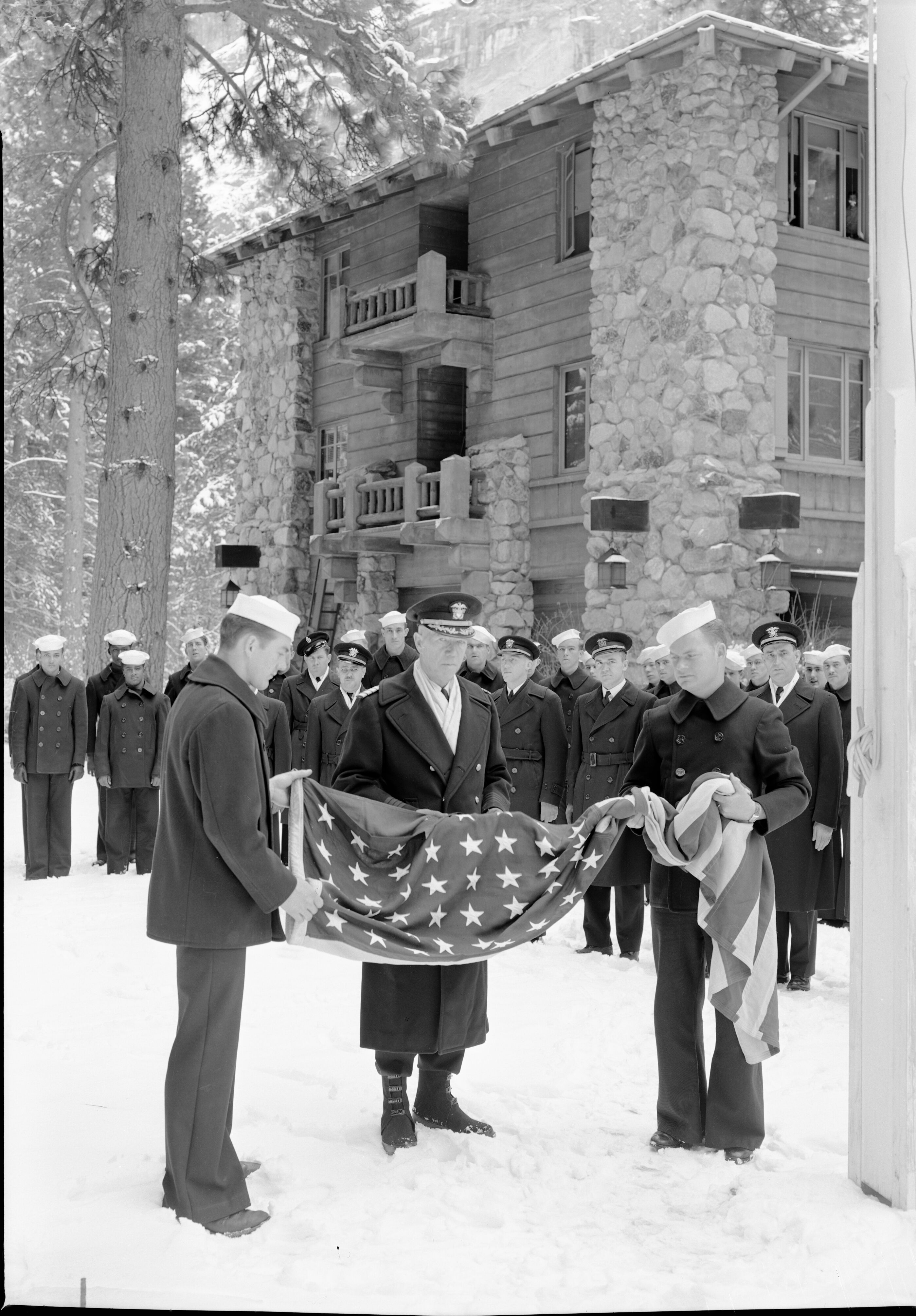 Military Group - Ahwahnee. Capt. R. Hayden; Lt. (JG) DF Shields; Lt. (JG) Scifers; Lt. (JG) O'Brien; Lt. K. Scott; Lt. Chesney; Lt. Margaret Clark; Lt. DM Nelson; Ch. parm. Sipe; Ens. Deterler; Pharm. Matson; Lt. F. Harris; Dr. Tepper; Pharm. J. Lilleg; Ch