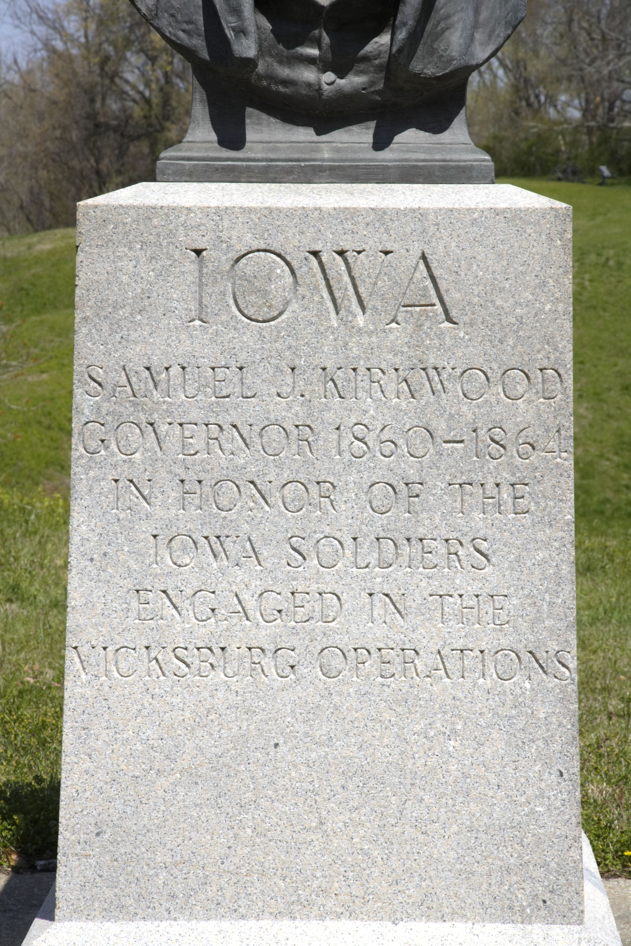 The hammered gray & black granite monument consists of a 32" x 30" x 48" rectangular pedestal with a 26" x 20 " x 40" bronze bust on top. The inscription is engraved on the front panel of the pedestal.