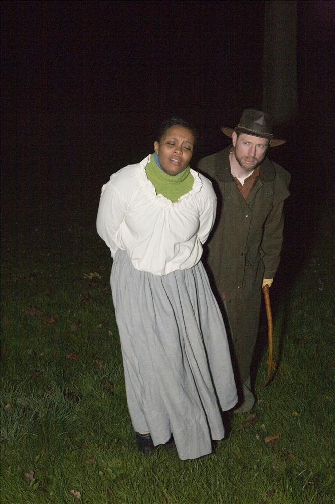 Volunteers practive their roles in a scene where a runaway slave is captured. || Cuyahoga Valley National Park interprets Ohio's Underground Railroad heritage because the centerpiece or our park, the Ohio & Erie Canal, was a likely route traveled by runaway slaves. Experience the Underground Railroad, offered each November, places visitors in the role of an escaping slave. The program is part of the National Underground Railway Network to Freedom which recongnizes historic sites, facilities, and programs that have a verifiable association to the Underground Railroad. The photos show volunteers at the dress rehearsal.