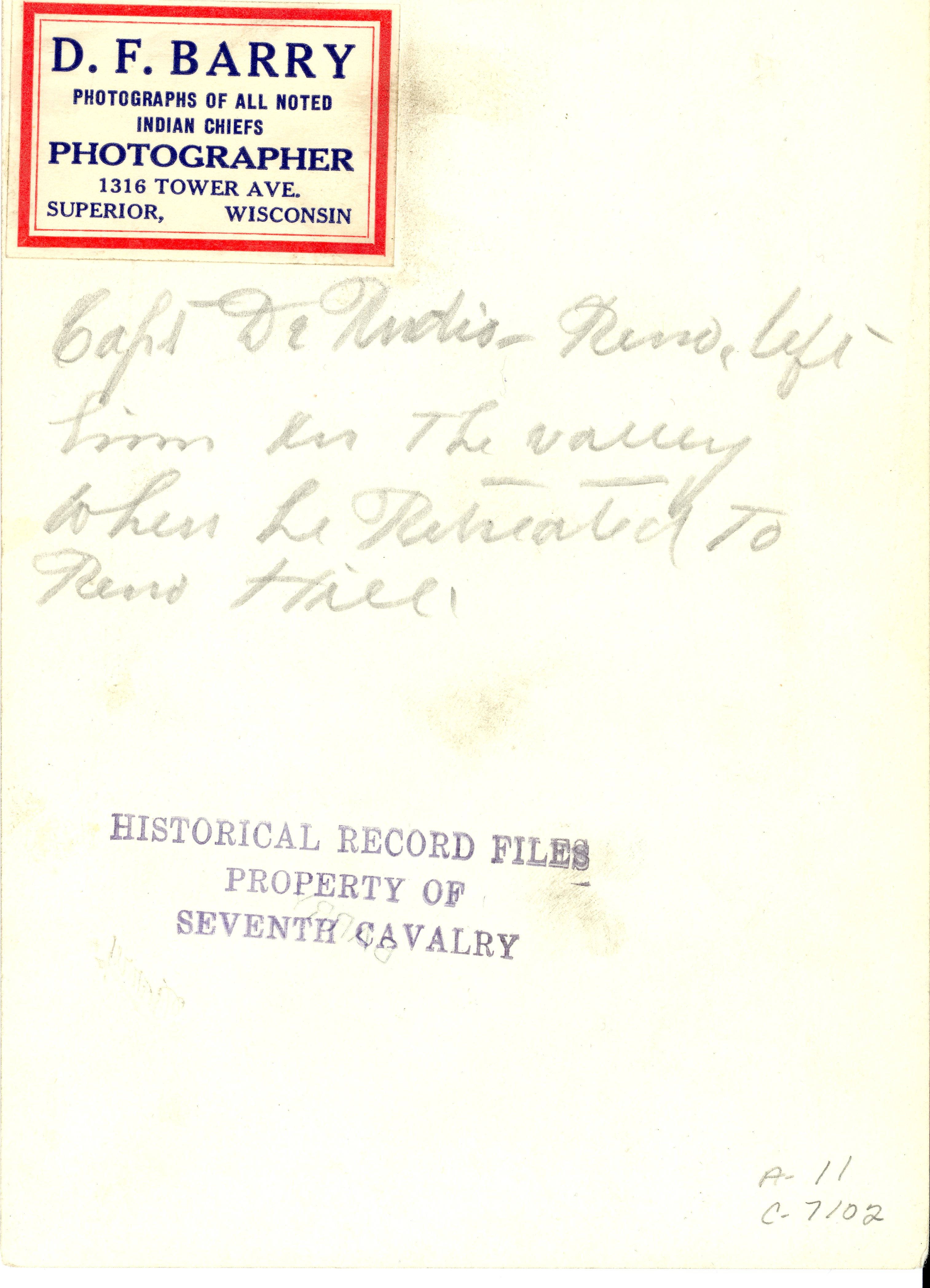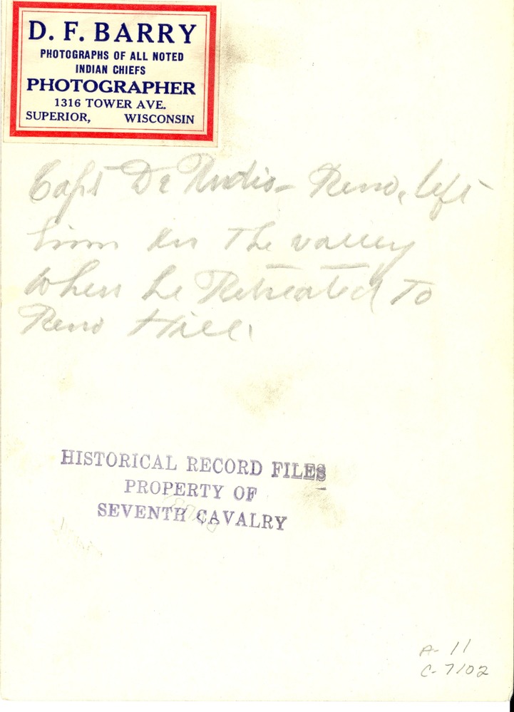 LIBI_00011_07102; A black-and-white photograph of Captain Charles Derudio, copyrighted by D. F. Barry, circa 1883. Derudio was a 1st Lt. at time of Little Bighorn. Reverse has Barry label. Derudio is shown wearing full-dress uniform.; PRINT, PHOTOGRAPHIC; Courtesy of the National Park Service, Little Bighorn Battlefield National Monument, LIBI_00011_07102, D. F. Barry, "Captain Charles Derudio in Full Dress Uniform," circa 1883