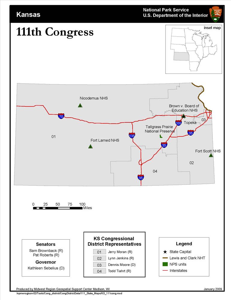 This set of maps displays the congressional districts for states located within the Midwest Region (AR, IA, IL, IN, KS, MI, MN, MO, ND, NE, OH, SD, WI). The maps provide district boundaries, as well as the state's senators, representatives, and governor.