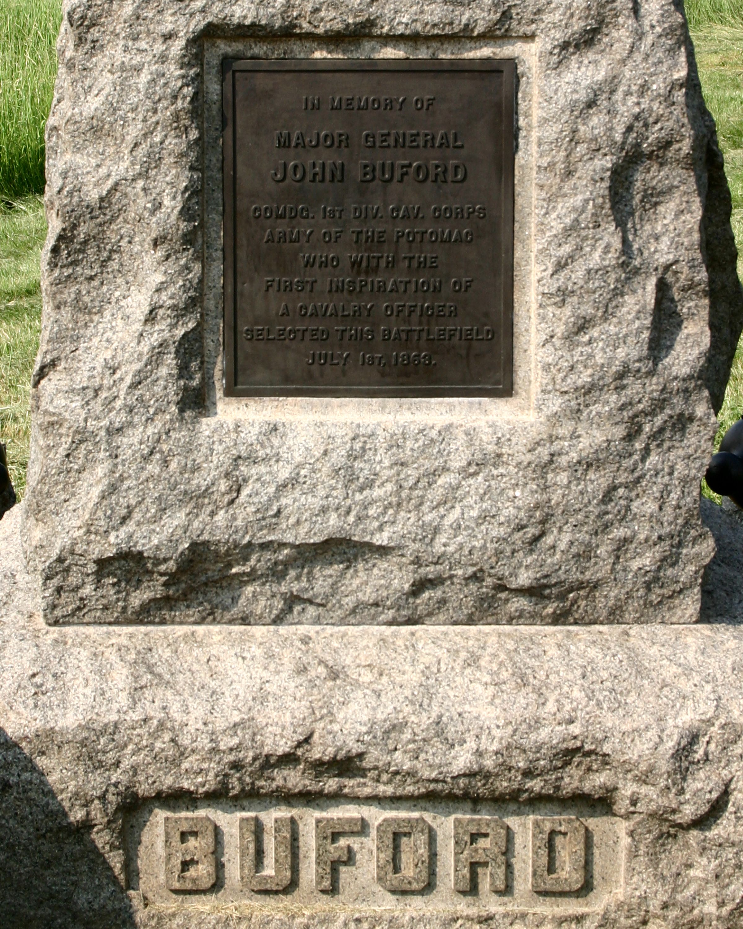 Marks spot where Buford stood on a.m. of July 1, 1863 & ordered Calef to open fire with his battery. Located on McPherson Farm between Chambersburg Pike & RR line. Incorps 4 cannons of Calef's battery & base, including tube that fired opening shot. || Mn & 4 cannons. Statue, 9' high on rough hewn pedestal, 3'6" sq, 4'6" high. Base 5'sq 2' thick. Inscription on S of base. Bronze inscription tablets on N & S of pedistal. At 4 corners 3' ordinace rifle tubes mounted on slabs.