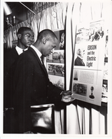 Visitors examining poster, "Edison and the Electric Light," at unidentified exhibition.