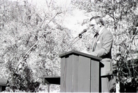 BW Photos of the Zion Lodge Rededication Ceremony. Superintendent Harold (Harry) Grafe speaking with man and woman. ; ZION Museum and Archives Image 800_20_01007 ; ZION 15933