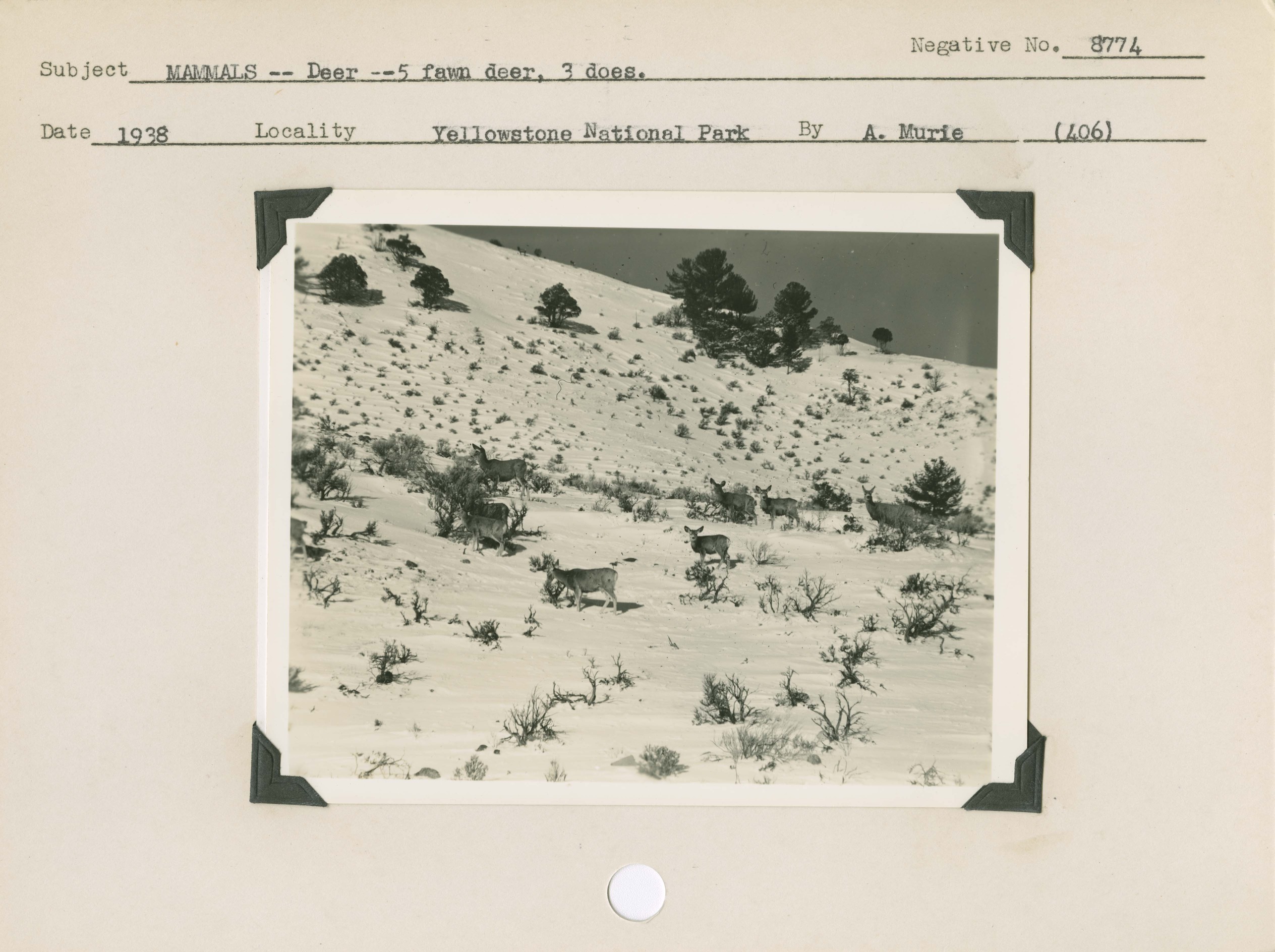 Mammals—Mule Deer – 5 fawn deer, 3 does. Locality: Mammoth, Yellowstone National Park. Negative: 8774. Location of Negative: San Francisco. [Some of this information comes from the reverse of the envelope for this negative number.].