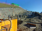 A muddy slope with two rows of evenly spaced micropile tubes run uphill. To the left is a sheer face of the hillside covered with sprayed concrete.