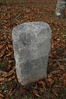worn stone marker surrounded by brown leaves; inscription not entirely readable, but can make out "...trace...shoe Bend...erected 1914"