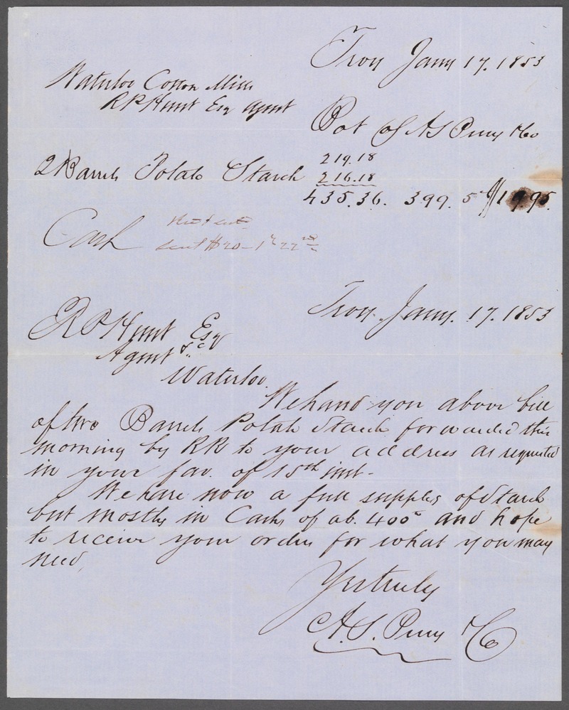 On front of document: “Troy Jany 17, 1853 Waterloo Cotton Mill R P Hunt Esq Agent Bot of A J Perry & Co 2 Barrels Potato Starch 219.18 216.18 [Sum of above] 435.36 399.5 $19.95 Cash [Recd & ?] Sent $20 - 1mo 22nd Troy Jany 17, 1853 R P Hunt Esq Agent Waterloo We hand you above bill of two Barrels Potato Starch forwarded this morning by RR to your address as requested in your fav. of 15th inst. We have now a full supplies of Starch but mostly in Cash, of ab 400 and hope to receive your order for what you may need Yrs truly A.J. Perry & Co” On back of document: "A.S. Perry & Co Bbl Starch 1mo 17th 53"