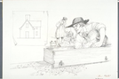 Conceptual illustration depicts settlers pouring the second layer of a tabby wall of Lieutenant Primrose Maxwell's House; wood forms visible.